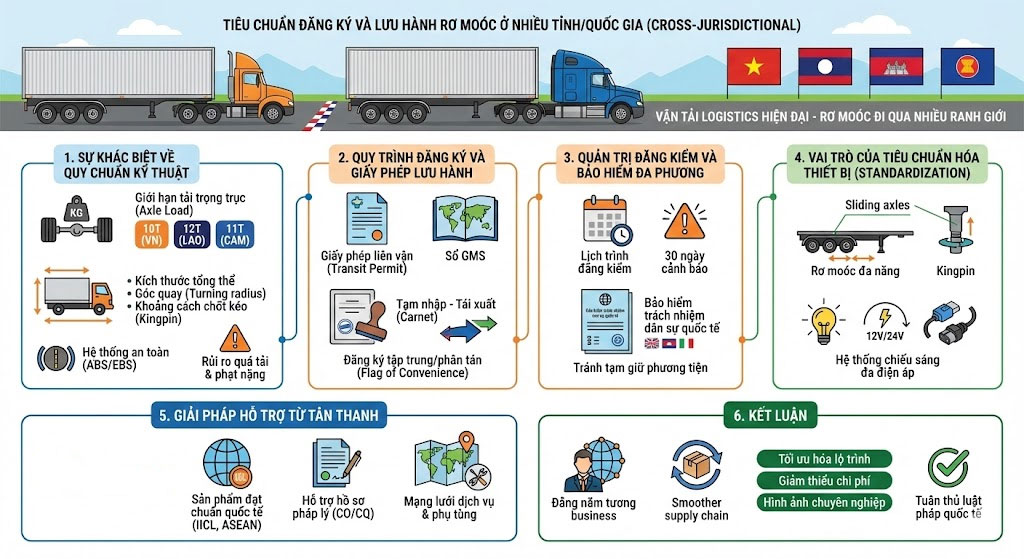 Trong ngành vận tải logistics hiện đại, rơ moóc thường xuyên phải di chuyển qua nhiều ranh giới địa lý với các hệ thống quy định khác nhau. Việc thiếu hiểu biết về tiêu chuẩn đăng ký và lưu hành liên bang hoặc xuyên biên giới có thể dẫn đến các khoản phạt nặng, việc giữ phương tiện tại cửa khẩu và làm đứt gãy chuỗi cung ứng. Quản trị rơ moóc “Cross-Jurisdictional” yêu cầu một chiến lược đồng bộ về mặt pháp lý và kỹ thuật.