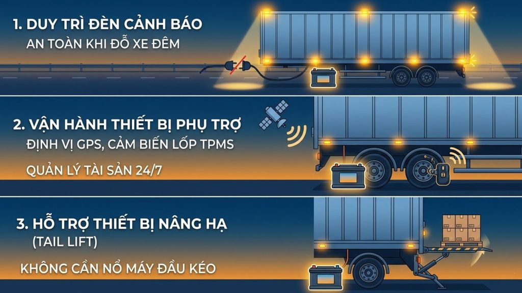 • Hỗ trợ hệ thống Tail lift hoặc chân chống thủy lực: Giúp các thiết bị này có thể vận hành nâng hạ một số chu kỳ ngắn mà không cần nổ máy xe đầu kéo, giảm tiếng ồn và khí thải tại điểm giao hàng.