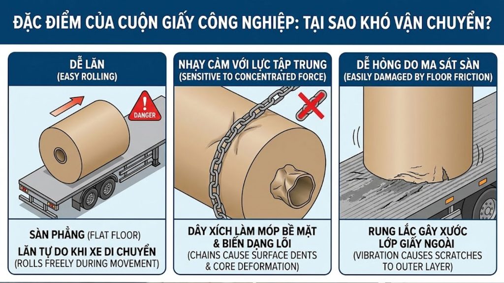 - Nhạy cảm với lực tập trung: Nếu dùng xích chằng trực tiếp, lực siết của xích sẽ làm móp bề mặt hoặc làm biến dạng “lõi giấy” (core), khiến cuộn giấy không thể đưa vào máy in tự động, gây thiệt hại toàn bộ lô hàng.