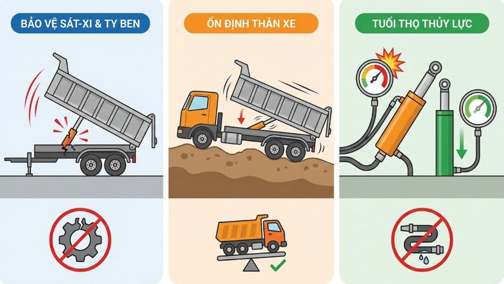 • Bảo vệ sát-xi và ty ben: Khi thùng ben hạ quá nhanh và dừng đột ngột (hết hành trình), lực quán tính cực lớn sẽ dồn lên các điểm chốt xoay, bát ben và dầm chính của sơ mi rơ moóc, dễ gây cong vênh hoặc nứt sắt-xi.