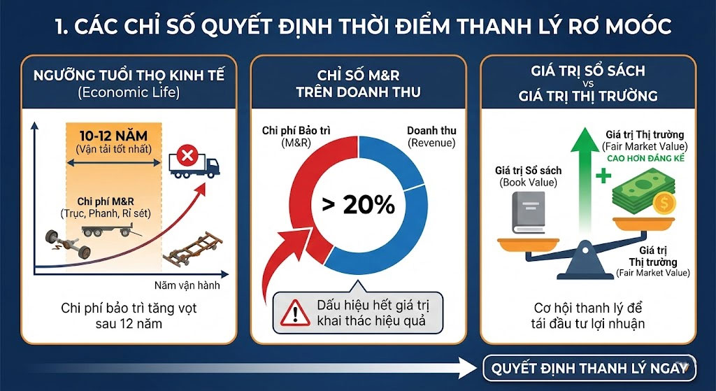 - Chỉ số M&R trên Doanh thu: Nếu chi phí bảo trì hàng năm vượt quá 20% doanh thu mà chiếc rơ moóc đó mang lại, đó là dấu hiệu tài sản đã hết giá trị khai thác hiệu quả.