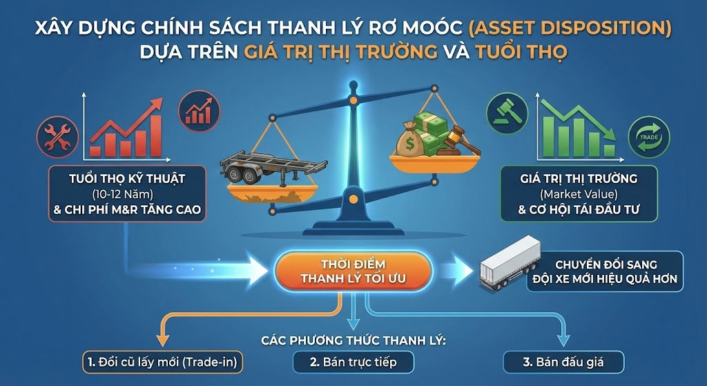 Trong quản trị tài sản vận tải, việc biết khi nào nên “chia tay” một chiếc rơ moóc cũng quan trọng như việc quyết định mua mới. Một chính sách thanh lý (Asset Disposition) thiếu khoa học sẽ dẫn đến hai kịch bản xấu: Hoặc là thanh lý quá sớm gây lãng phí giá trị sử dụng, hoặc là giữ lại quá lâu khiến chi phí bảo trì (M&R) “ăn mòn” hết lợi nhuận. Chính sách thanh lý hiệu quả phải là sự kết hợp giữa dữ liệu về tuổi thọ kỹ thuật và biến động của giá trị thị trường.